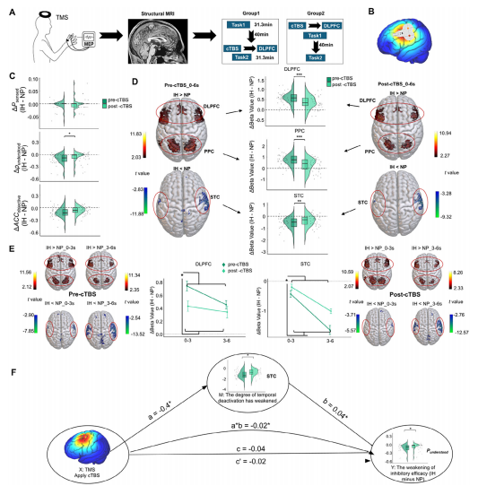 因果關(guān)系驗(yàn)證:cTBS對(duì)DLPFC的抑制性刺激,顯著削弱了感覺(jué)皮層的動(dòng)態(tài)失活過(guò)程,并直接導(dǎo)致了抑制任務(wù)表現(xiàn)的下降 。中介效應(yīng)分析證實(shí),DLPFC正是通過(guò)驅(qū)動(dòng)感覺(jué)皮層的動(dòng)態(tài)失活來(lái)實(shí)現(xiàn)其抑制功能,證明了該機(jī)制的因果性(圖3)。