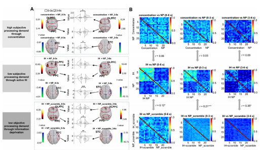 通過(guò)對(duì)比主動(dòng)抑制、主動(dòng)專(zhuān)注以及被動(dòng)信息剝奪(如聽(tīng)取雜亂音頻、閉眼)三種狀態(tài),檢驗(yàn)所發(fā)現(xiàn)的神經(jīng)動(dòng)態(tài)模式的特異性與普遍性。