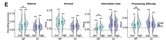 神經(jīng)表征的模糊化,直接導(dǎo)致了大腦解碼信息能力的下降。這一點(diǎn),在多變量模式分析(MVPA)中得到了進(jìn)一步的印證。研究訓(xùn)練了一個(gè)機(jī)器學(xué)習(xí)分類(lèi)器(就像一個(gè)“讀心”算法)來(lái)區(qū)分高、低強(qiáng)度的信息特征。結(jié)果顯示,在自然狀態(tài)下,分類(lèi)器可以精準(zhǔn)地從大腦活動(dòng)模式中解碼出這些信息。然而,在抑制狀態(tài)下,分類(lèi)器的解碼準(zhǔn)確率顯著下降,幾乎回到了隨機(jī)猜測(cè)的水平(圖6)。